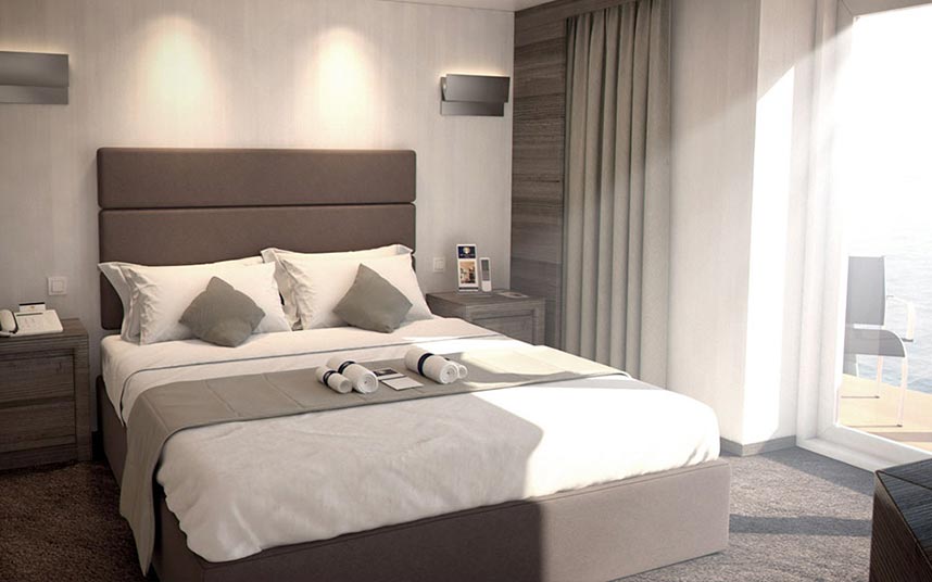 2 lower beds convertible to 1 queen-size bed, bathtub, shower. 140-319 sq. ft. Luxurious beds featuring Sealy Premium Euro-Top mattressesfinely woven cotton linens. Deluxe waffle weaveterry cloth bathrobes for use during your voyage. 100 Egyptian cotton towels. Premium massage showerheads. 5X magnifying make-up mirrorssalon-quality hair dryers. Fragrant soaps, lotions, shampooother bath amenities from Elemis Aromapure. Complimentary fresh fruit on request. Elegant ice bucketserving tray for in-stateroom beverages. Flat-panel TVDVD player. Ice service, shoeshine servicenightly turndown service.
